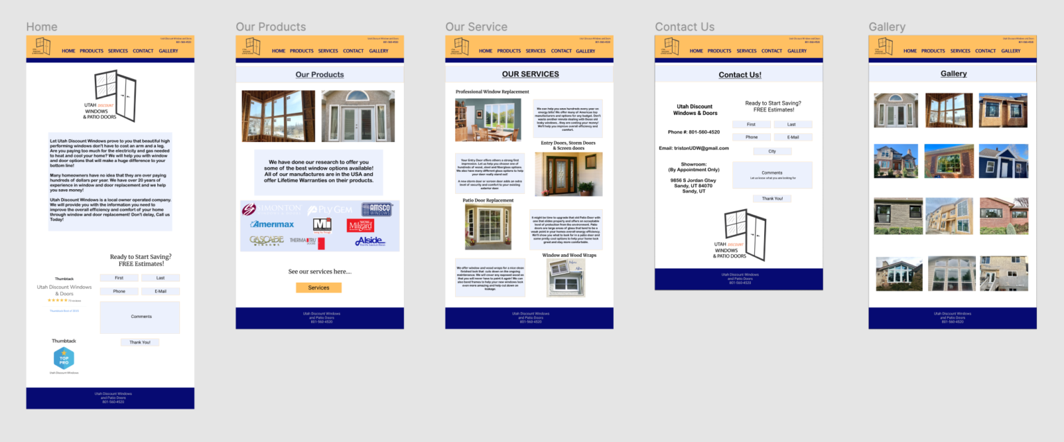 For a service-learning project, our team was tasked to help Utah Discount Windows & Patio Doors with a brand refresh involving a new logo design, website prototype, business card, and flyer. To do this our team used rigorous user testing to get feedback for our deliverables and end up with a final product we were proud of. This project gave me great experience developing and conducting user tests, taking that feedback, and implementing it into our project. It showed me how valuable that feedback is to make revisions. The outside perspectives we got gave us ideas we would have never thought about on our own. The final product included the deliverables mentioned above, a functional website prototype using Figma, and a final case study breaking down the entire project and outcomes.